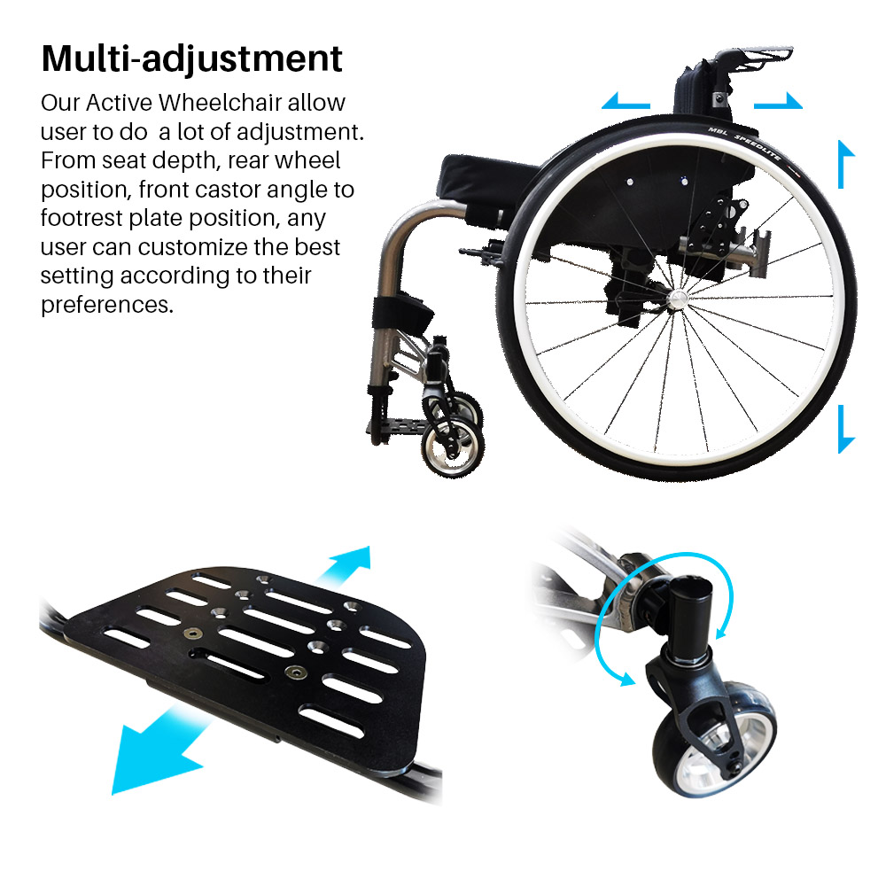 Active at 11kg is a very lightweight wheelchair made for easy adjustment of multiple parts. Even an expensive custom-made wheelchair often may not be perfect upon usage. We resolve this issue by getting the balance of reasonable price and adjustability.