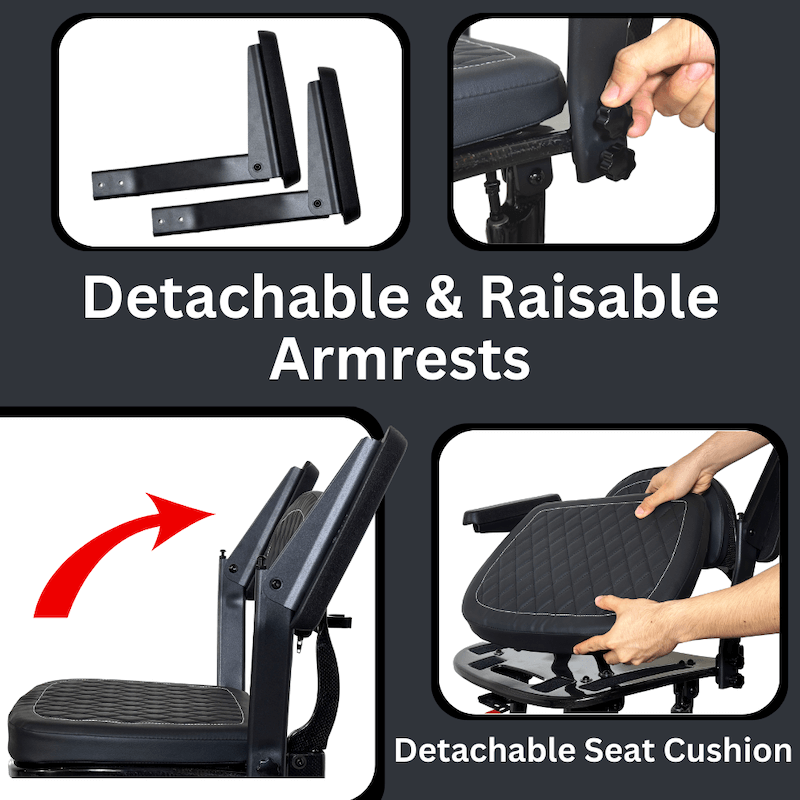 The flip-up armrests are height-adjustable and detachable for convenience