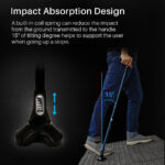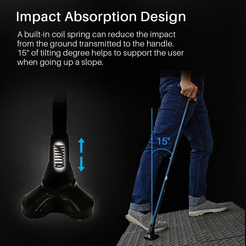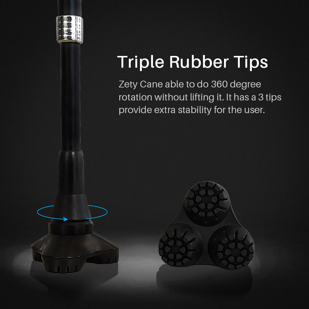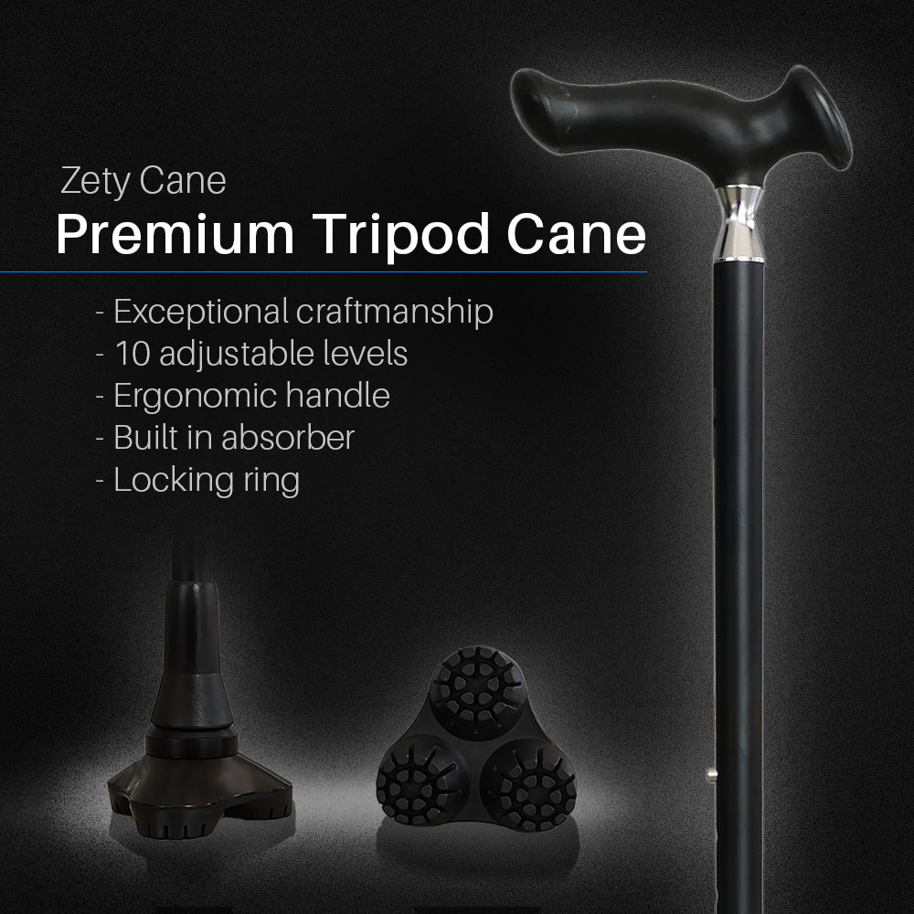 The Zety Cane by Freedom Gain is a stylish, high-quality cane with a 360-degree rotating tripod tip for better balance, reduced wrist pressure, and added comfort. It features suspension and stands upright when not in use.